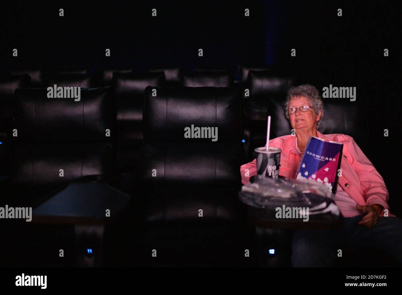 Yonkers Usa 23rd Oct 2020 Moviegoer Bernadette Reynolds From Yonkers Watches Trailers Inside Showcase Cinema De Lux Theaters Before The Start Of A Movie On The First Day Of Movie Houses Allowed